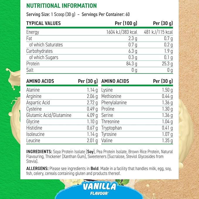 Kombinasjonen av soya-, ert- og brunrisprotein gir et komplett spekter av essensielle aminosyrer og høyt BCAA-innhold.